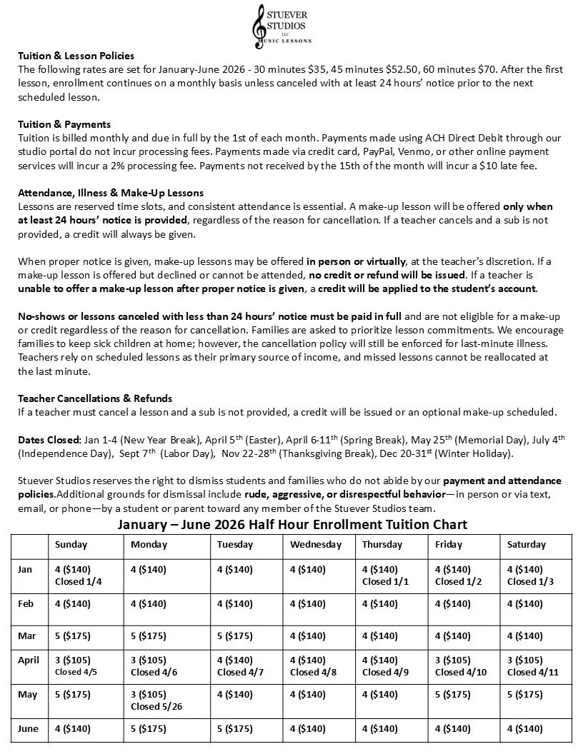 The following rates are set for January-June 2026 - 30 minutes $35, 45 minutes $52.50, 60 minutes $70. After the first lesson, enrollment continues on a monthly basis unless canceled with at least 24 hours’ notice prior to the next scheduled lesson.